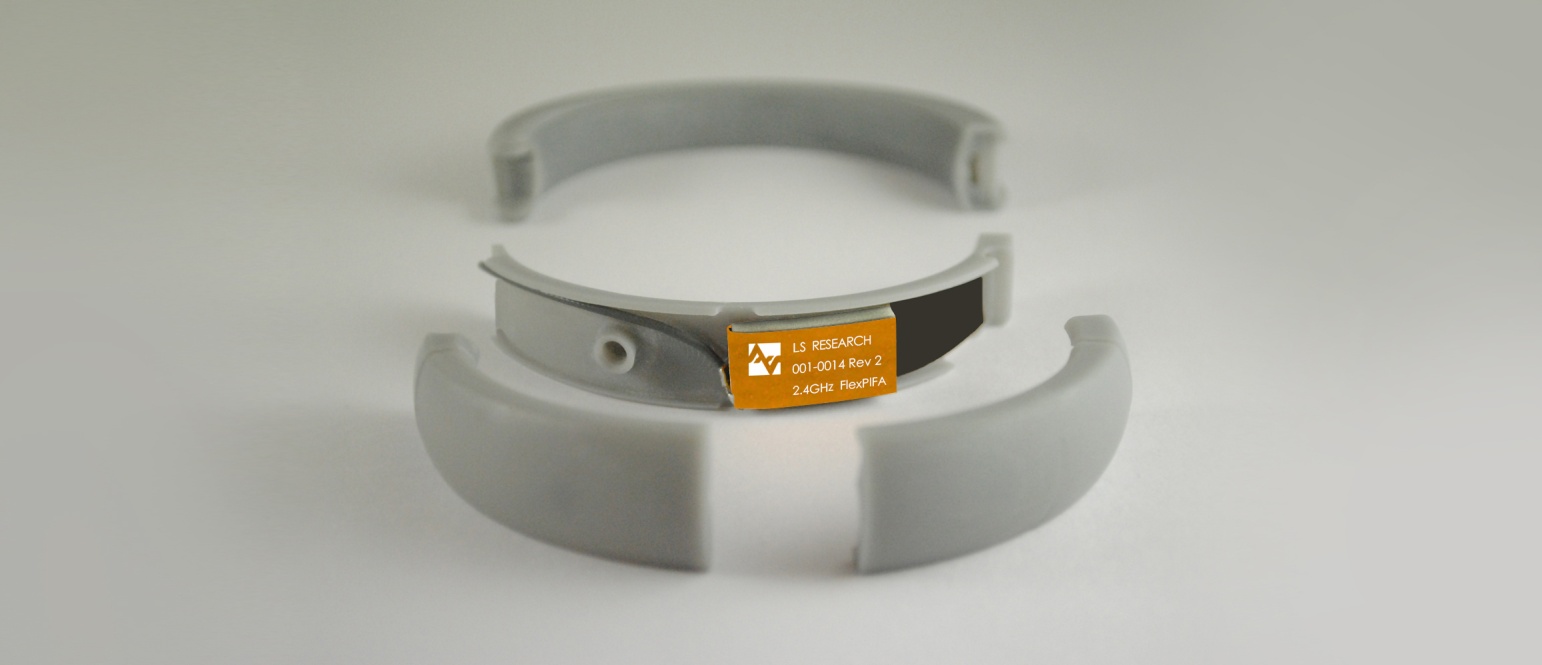 Quite often this separation distance between the body tissue and the FlexPIFA is already provided by the enclosure. Below is an example of a bracelet with the FlexPIFA integrated inside it. The enclosure provides enough spacing between the antenna and body tissue to prevent any major detuning. The enclosure is made of polycarbonate.