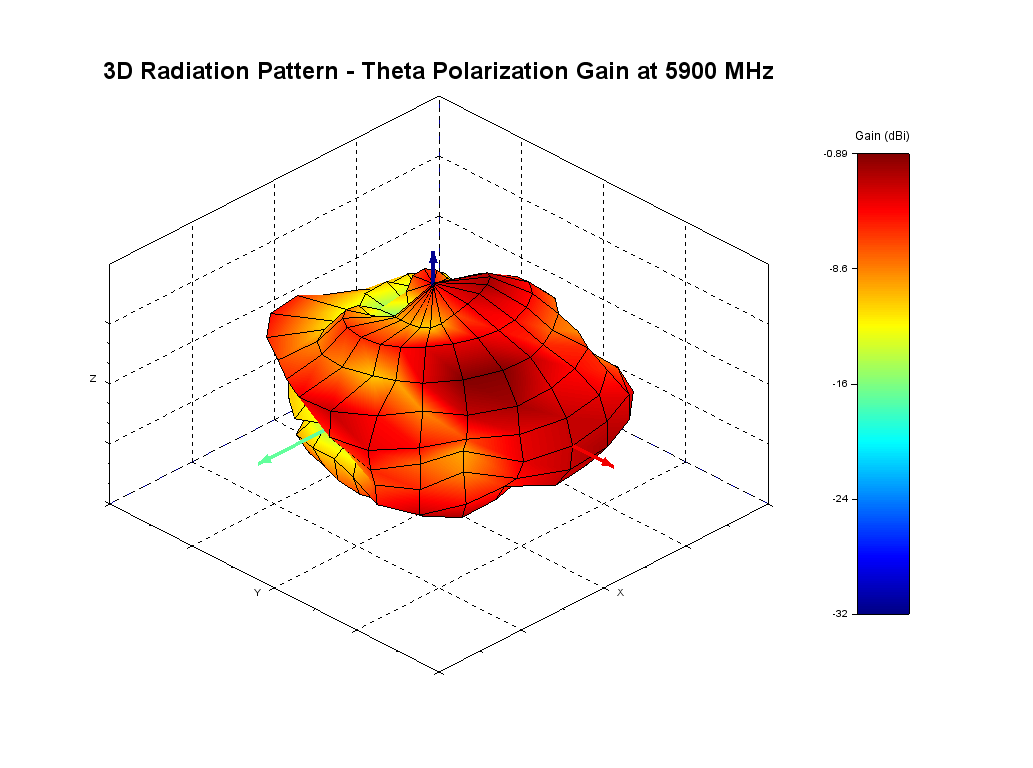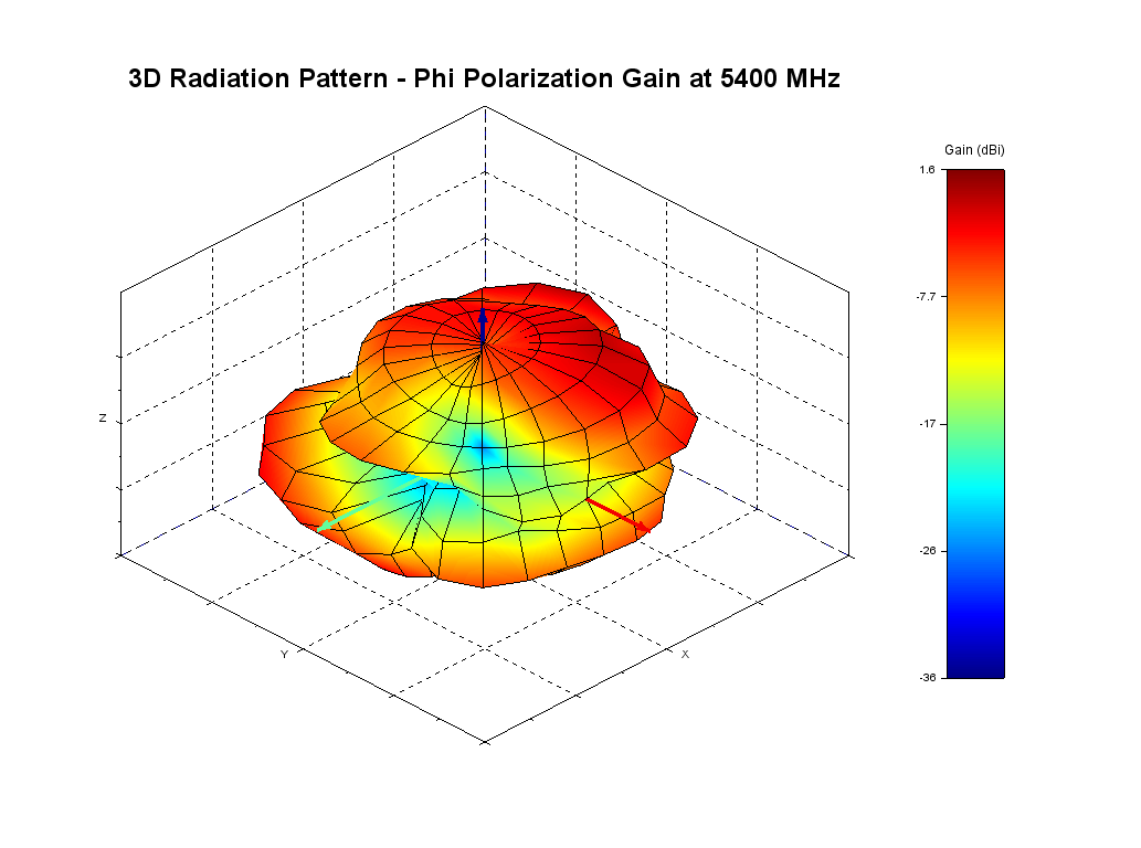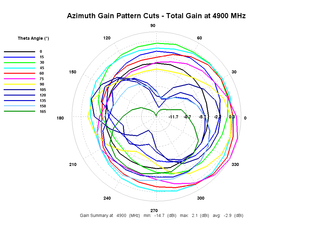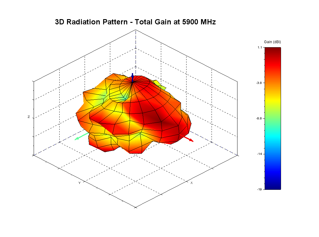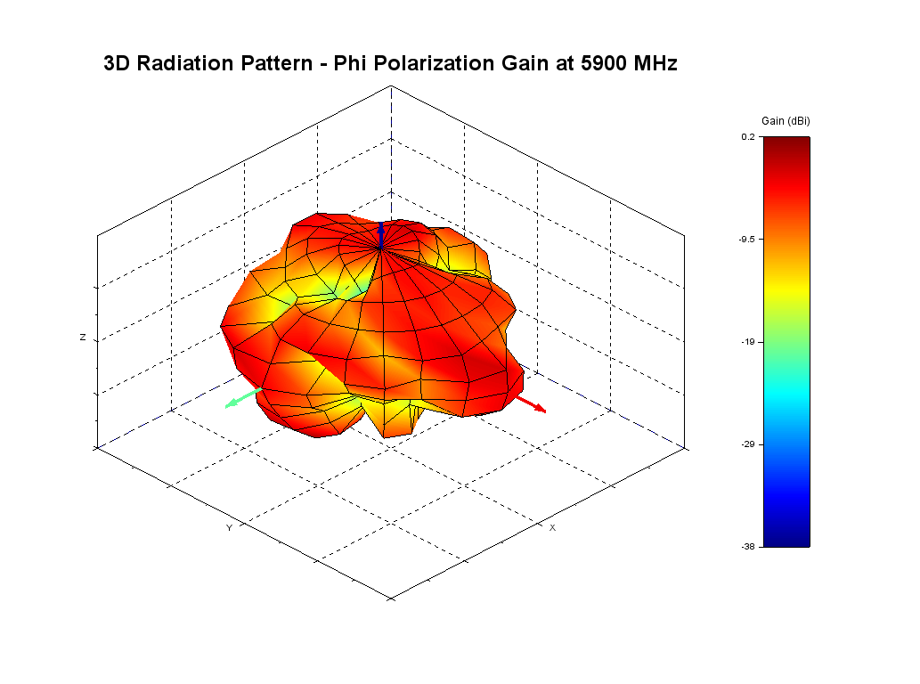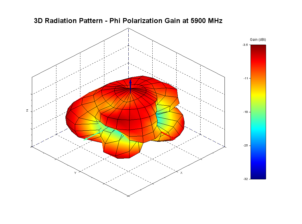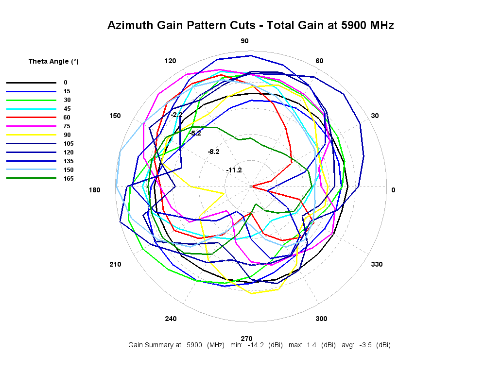 Antenna measurements such as VSWR were measured with an Agilent E5071C vector network analyzer. Radiation patterns were measured with a CMT Planar 804/1 vector network analyzer in a Howland Company 3100 chamber equivalent. Phase center is nine inches above the Phi positioner.