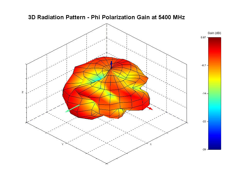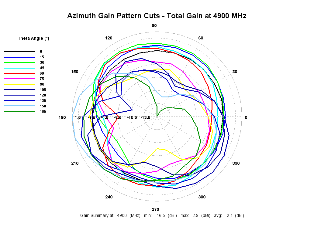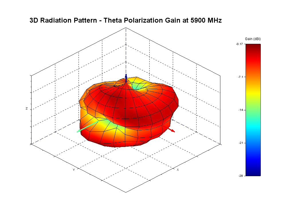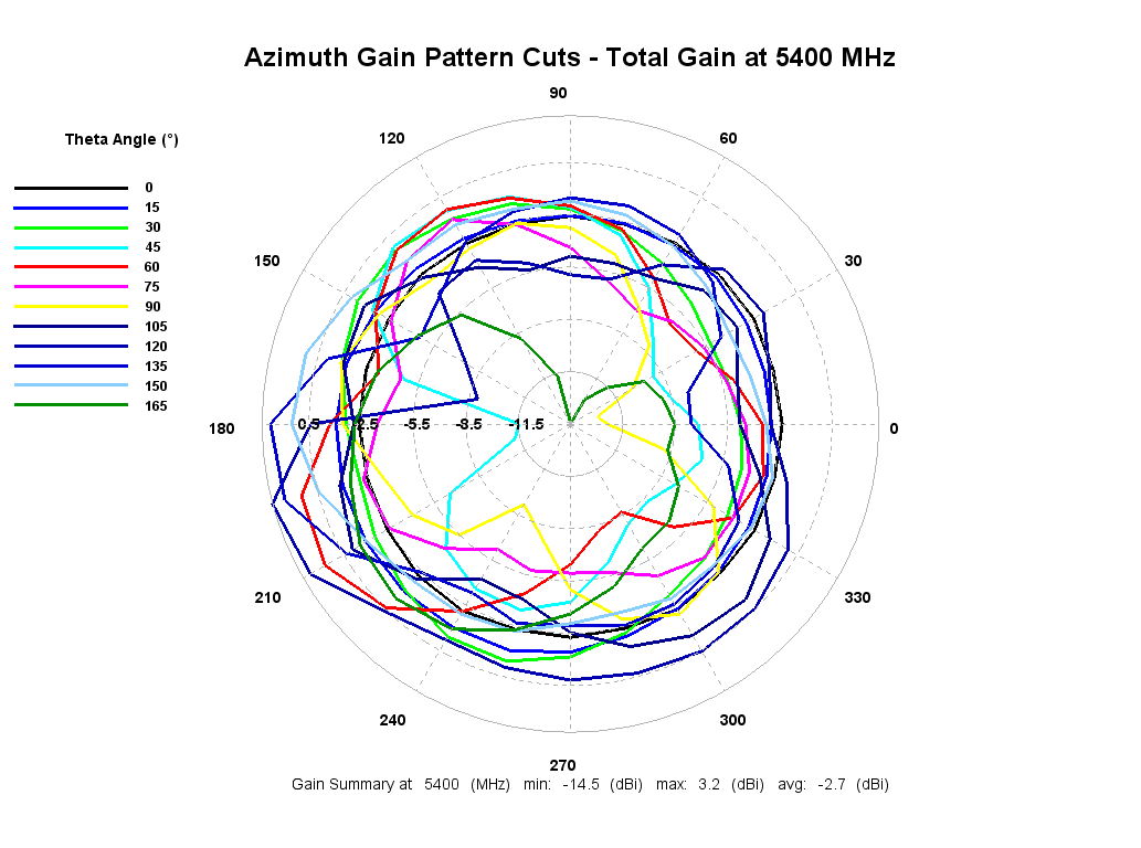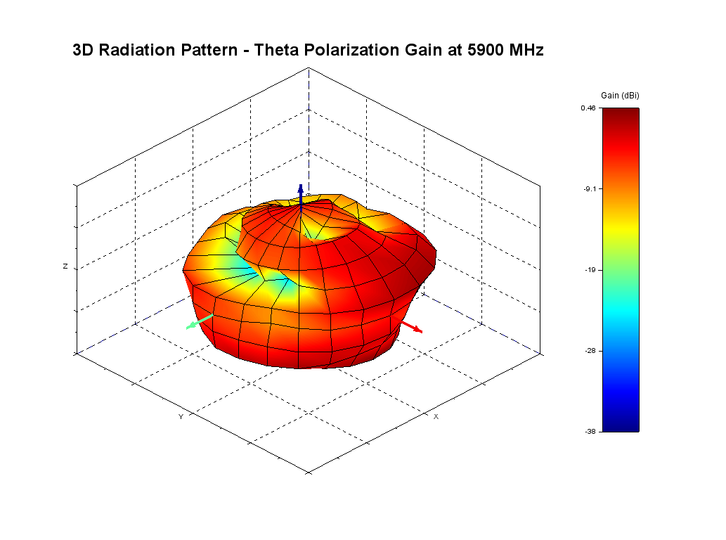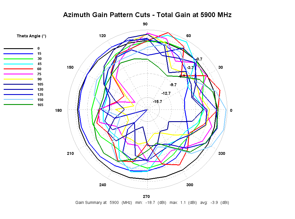 Antenna measurements such as VSWR were measured with an Agilent E5071C vector network analyzer. Radiation patterns were measured with a CMT Planar 804/1 vector network analyzer in a Howland Company 3100 chamber equivalent. Phase center is nine inches above the Phi positioner.