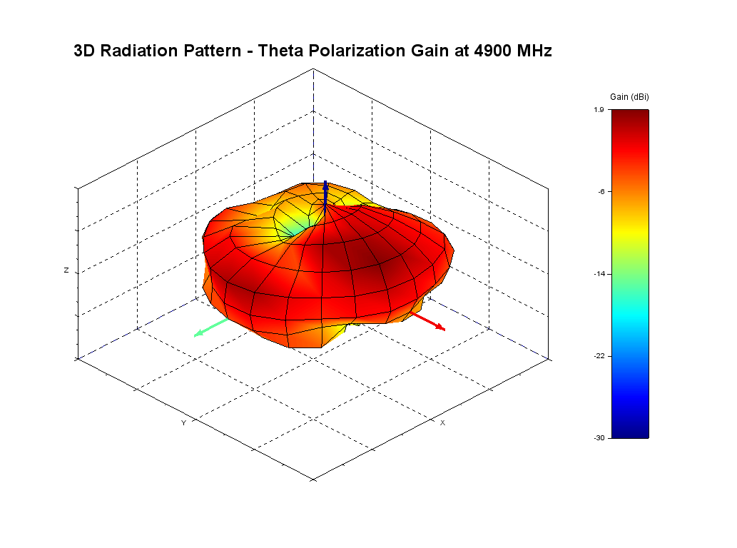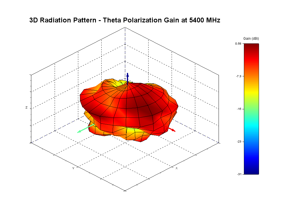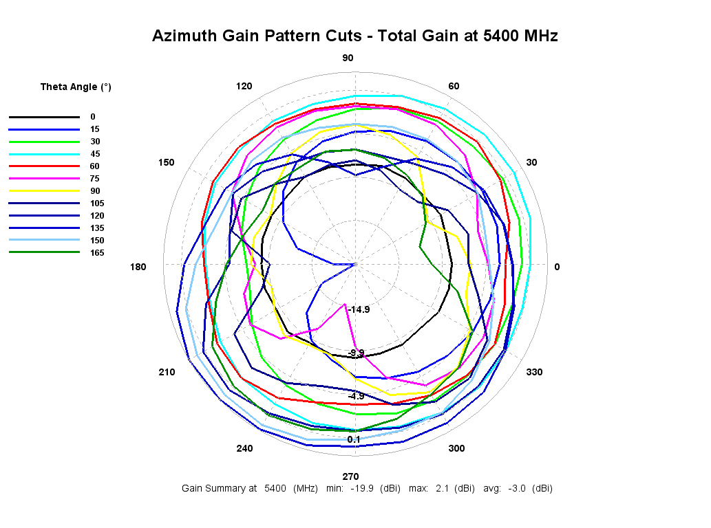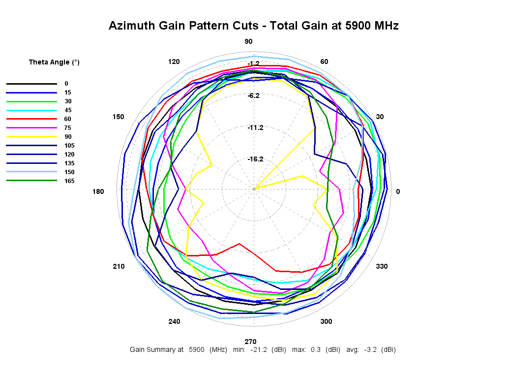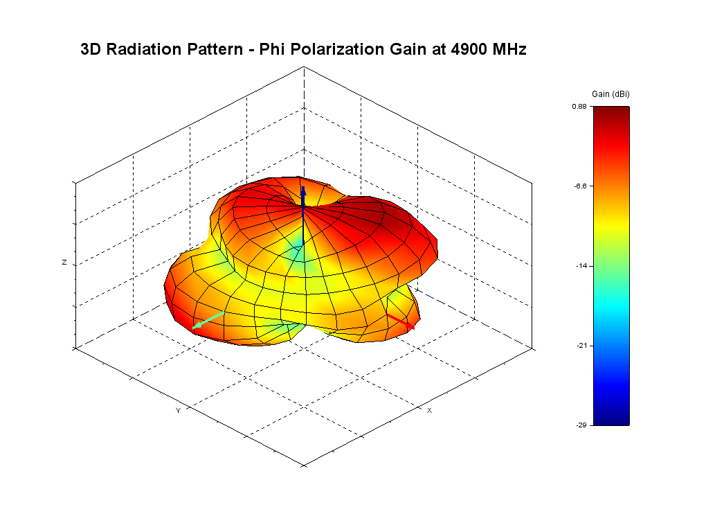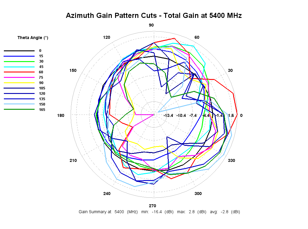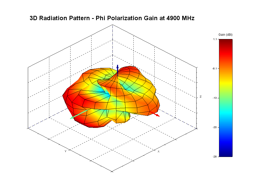 Antenna measurements such as VSWR were measured with an Agilent E5071C vector network analyzer. Radiation patterns were measured with a CMT Planar 804/1 vector network analyzer in a Howland Company 3100 chamber equivalent. Phase center is nine inches above the Phi positioner.