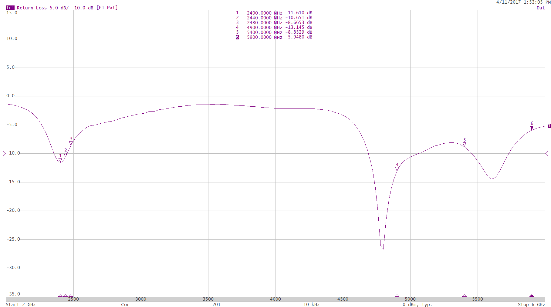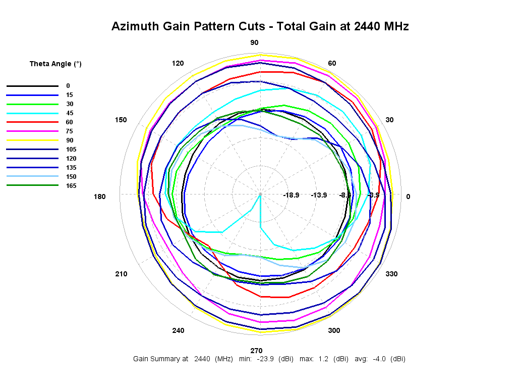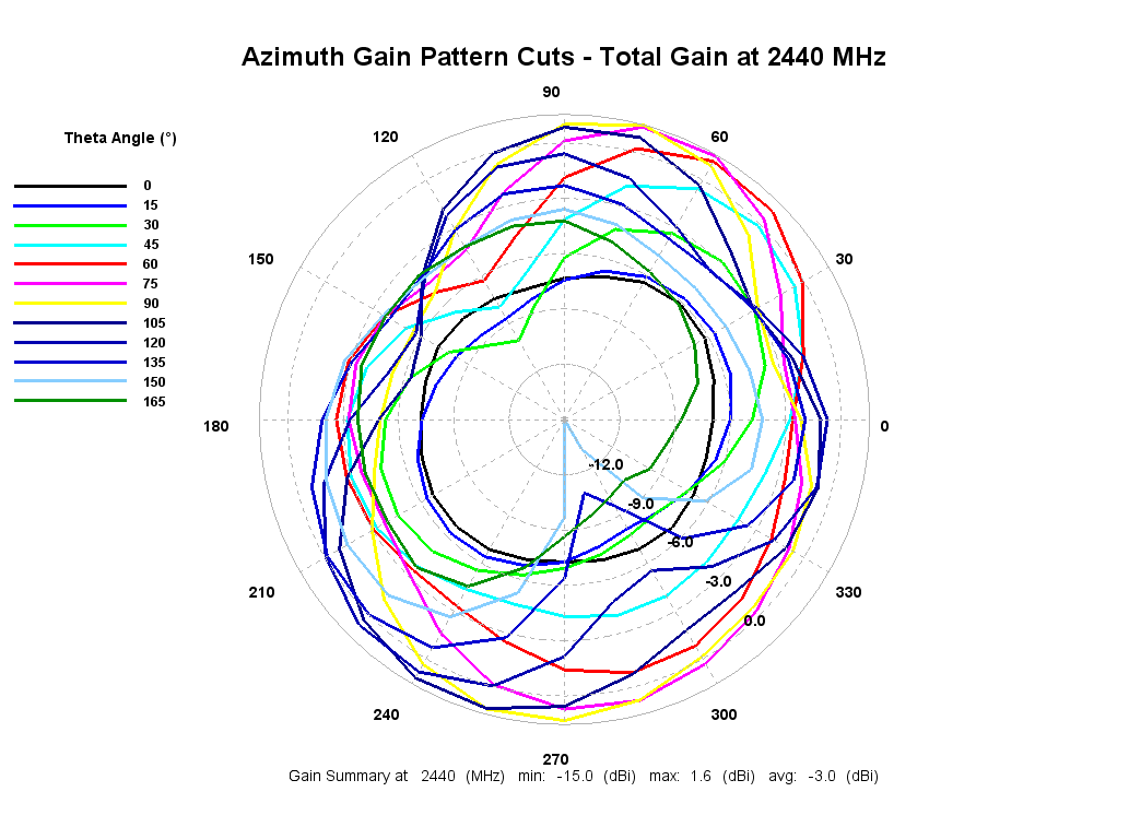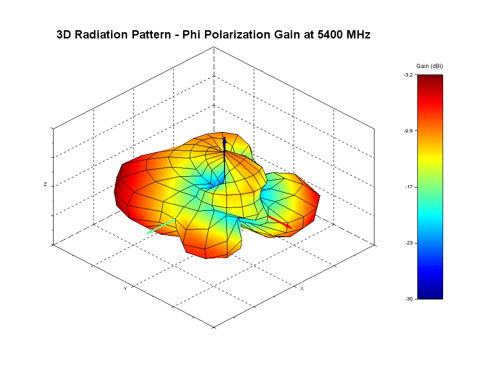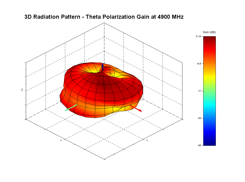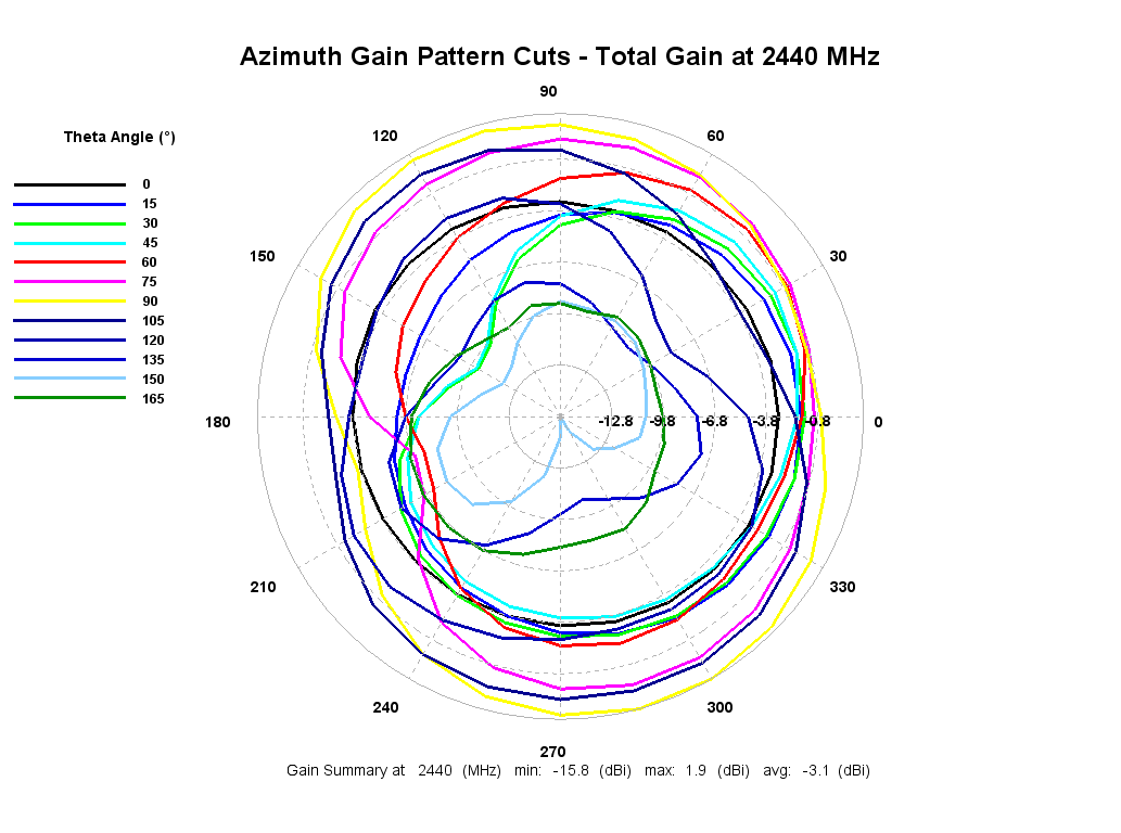 Antenna measurements such as VSWR were measured with an Agilent E5071C vector network analyzer. Radiation patterns were measured with a CMT Planar 804/1 vector network analyzer in a Howland Company 3100 chamber equivalent. Phase center is nine inches above the Phi positioner.