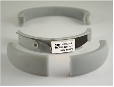Quite often this separation distance between the body tissue and the FlexPIFA is already provided by the enclosure. Below is an example of a bracelet with the FlexPIFA integrated inside it. The enclosure provides enough spacing between the antenna and body tissue to prevent any major detuning. The enclosure is made of polycarbonate.