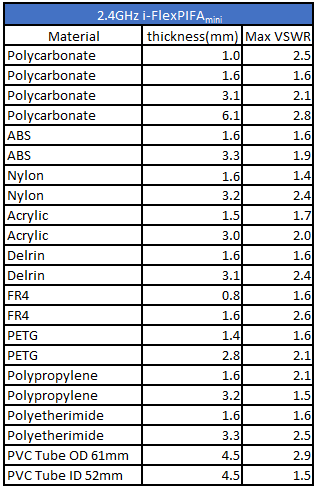 The VSWR of the i-FlexPIFAmini is shown below for the following materials and thicknesses outside of these specifications: