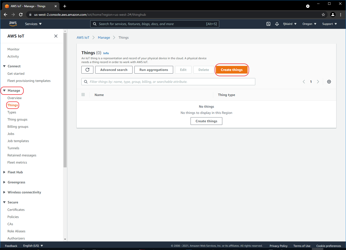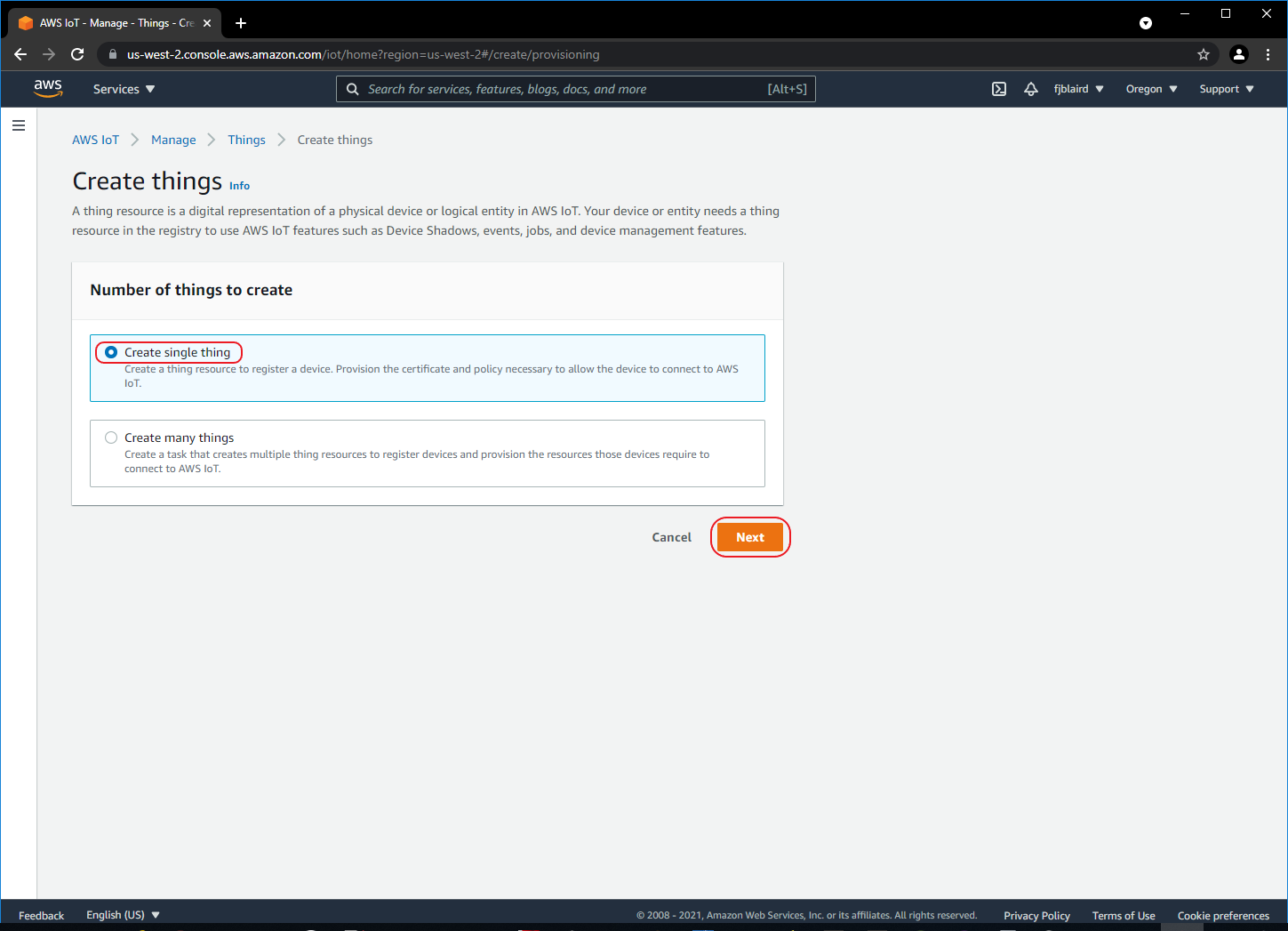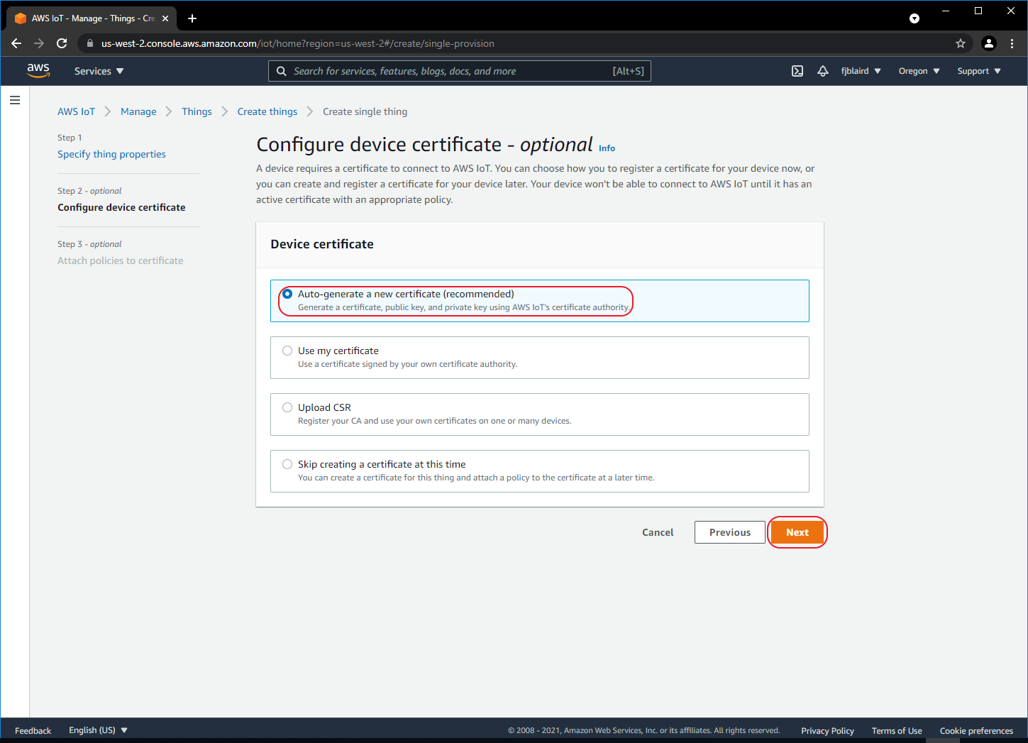 [ ] Attach the policy that we created to MySensor by selecting MyPolicy and then click Create thing.
