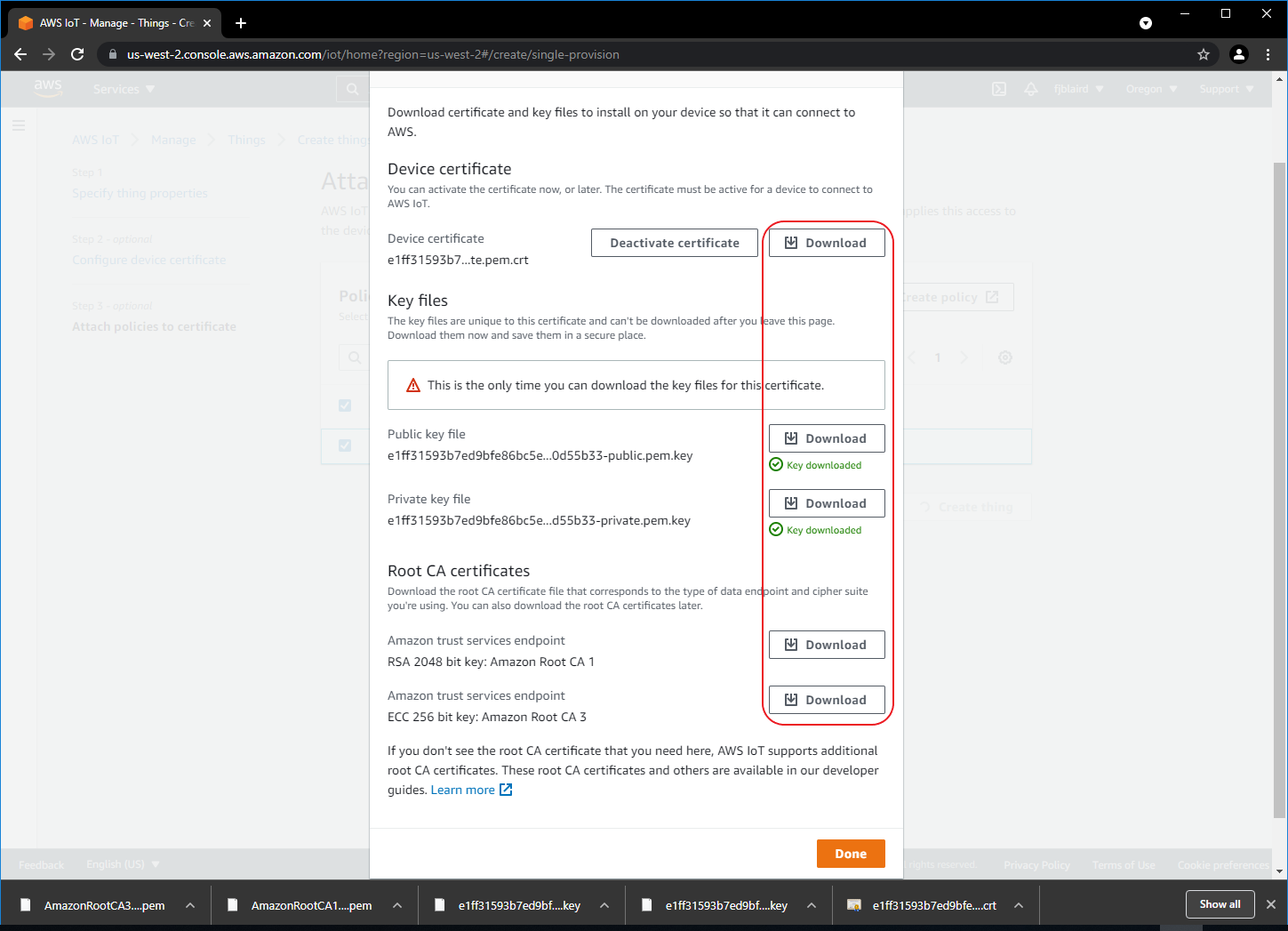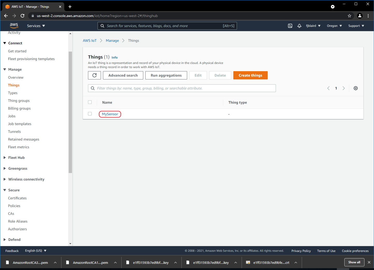 [ ] Download the MySensor certificate, public and private keys, and the Amazon Root CA certificates into the examples folder of the Python Samples Apps. Note, for this tutorial, we really just need the MySensor certificate and private keys, but you may download all the certificates and keys in case you need them in the future.