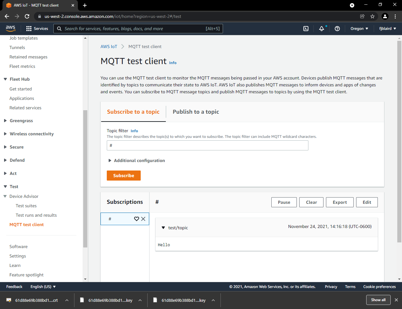 [ ] The hello message is received on the AWS MQTT Test Client.