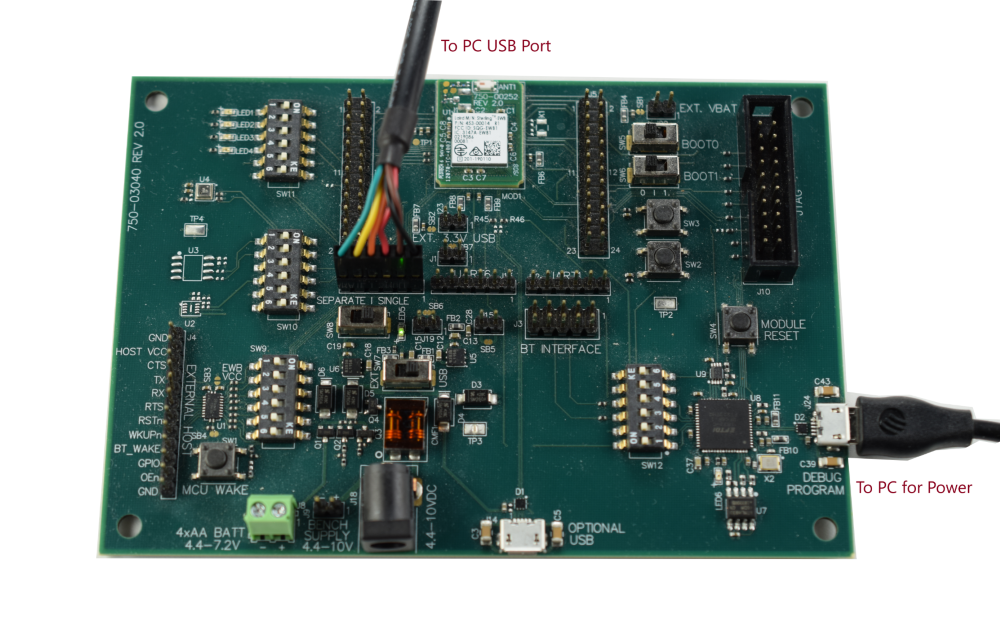 Supply power to the development board via J24. Connect the TTL-232R-3V3 cable to J7 as shown below and then connect the other end of the cable to the your Windows PC. Then use Windows Device Manager determine the COM port for the TTL-232R-3V3. For this tutorial, we will use COM30.