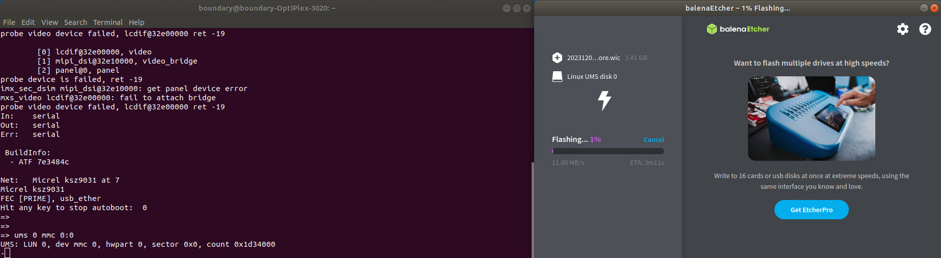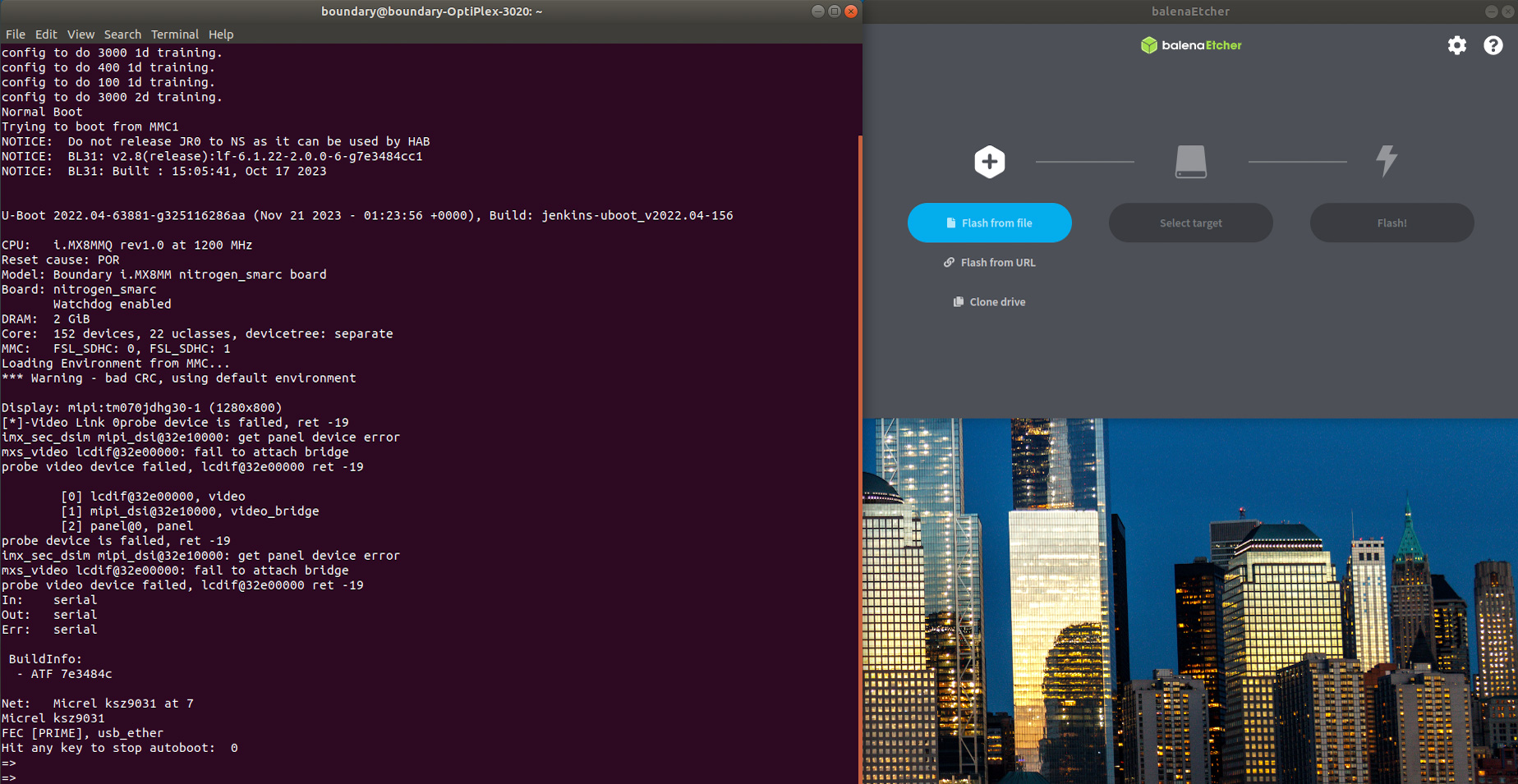Power up the board and stop auto-boot process to get U-Boot prompt. Enter any character on the terminal software to stop auto-boot. Open up balenaEtcher.