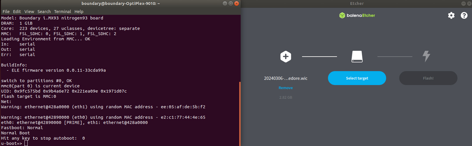 Power up the board and stop auto-boot process to get U-Boot prompt. Enter any character on the terminal software to stop auto-boot. Open up balenaEtcher.
