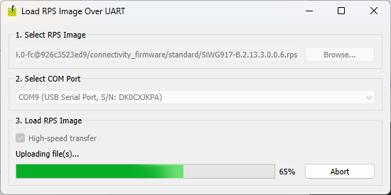 3.) Click the “Browse…” button and locate the .rps file from the connectivity_firmware/standard subdirectory of the WiSeConnect SDK.
