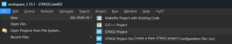 1.) Start by creating a new project in the STM32CubeIDE by clicking “File → New → STM32 Project”.