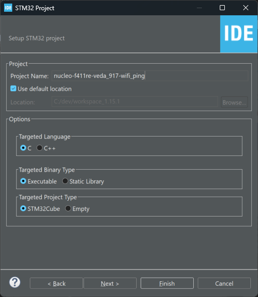 To get started with NCP mode and an STM32 MCU, this guide will walk through typical steps for configuring a project using the STM32CubeIDE from ST Micro. The first step is to create a new project in the STM32CubeIDE configured with FreeRTOS support and appropriate pin mappings for SPI/UART/GPIO interface to the Veda SL917 module. The following sections walk through typical steps for developing a Wi-Fi or Bluetooth enabled application using the STM32CubeIDE. For general documentation on how to use the STM32CubeIDE, refer to the Documentation section of the STM32CubeIDE website.