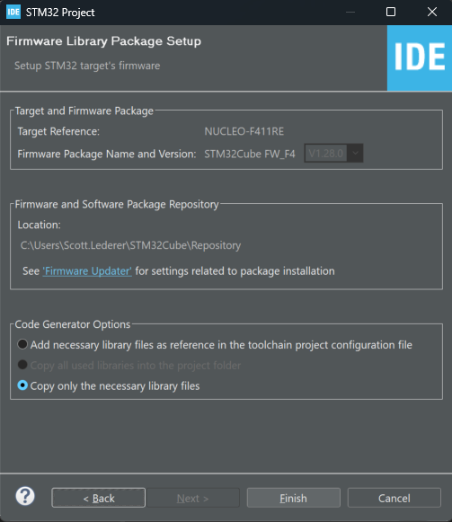 4.) Leave settings at defaults for the “Firmware Library Package Setup” page and click Finish to continue.