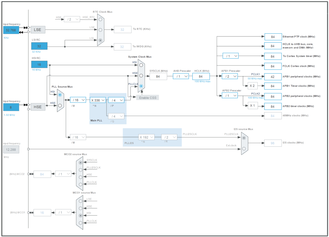 7.) When setting up the Nucleo-F411RE board in STM32CubeIDE, the default setting for clocks can be used. Here is a snapshot of the settings used in this example for reference: