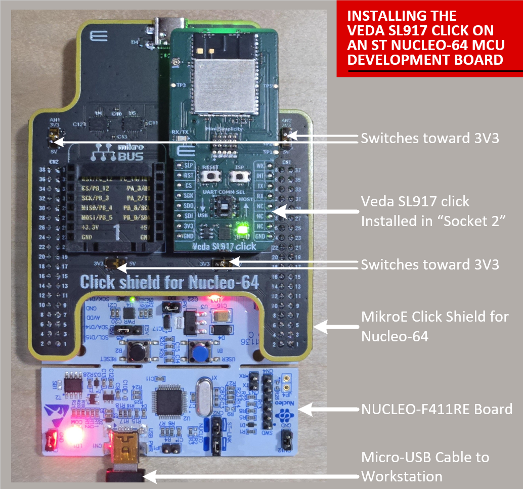 In order to attach the Veda SL917 Click board to an STM32 NUCLEO64 development board, an adapter is required to map the Morpho header pins to a mikroBUS socket. A convenient approach is to use the Click Shield for Nucleo-64 manufactured by MikroE.